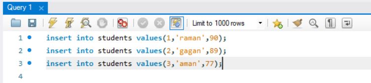 insert into students(1,’raman’,90);