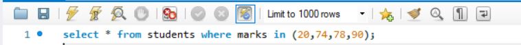 select * from students where marks in (20,74,78,90);