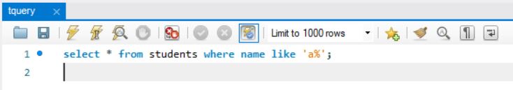 select * from students where name like ‘a%’;