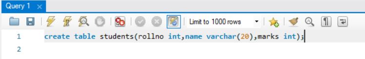 create table students(rollno int,name varchar(20),marks int);