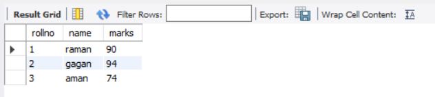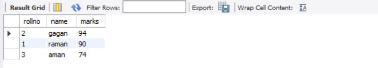 above query will display data for columns rollno and marks from stable students